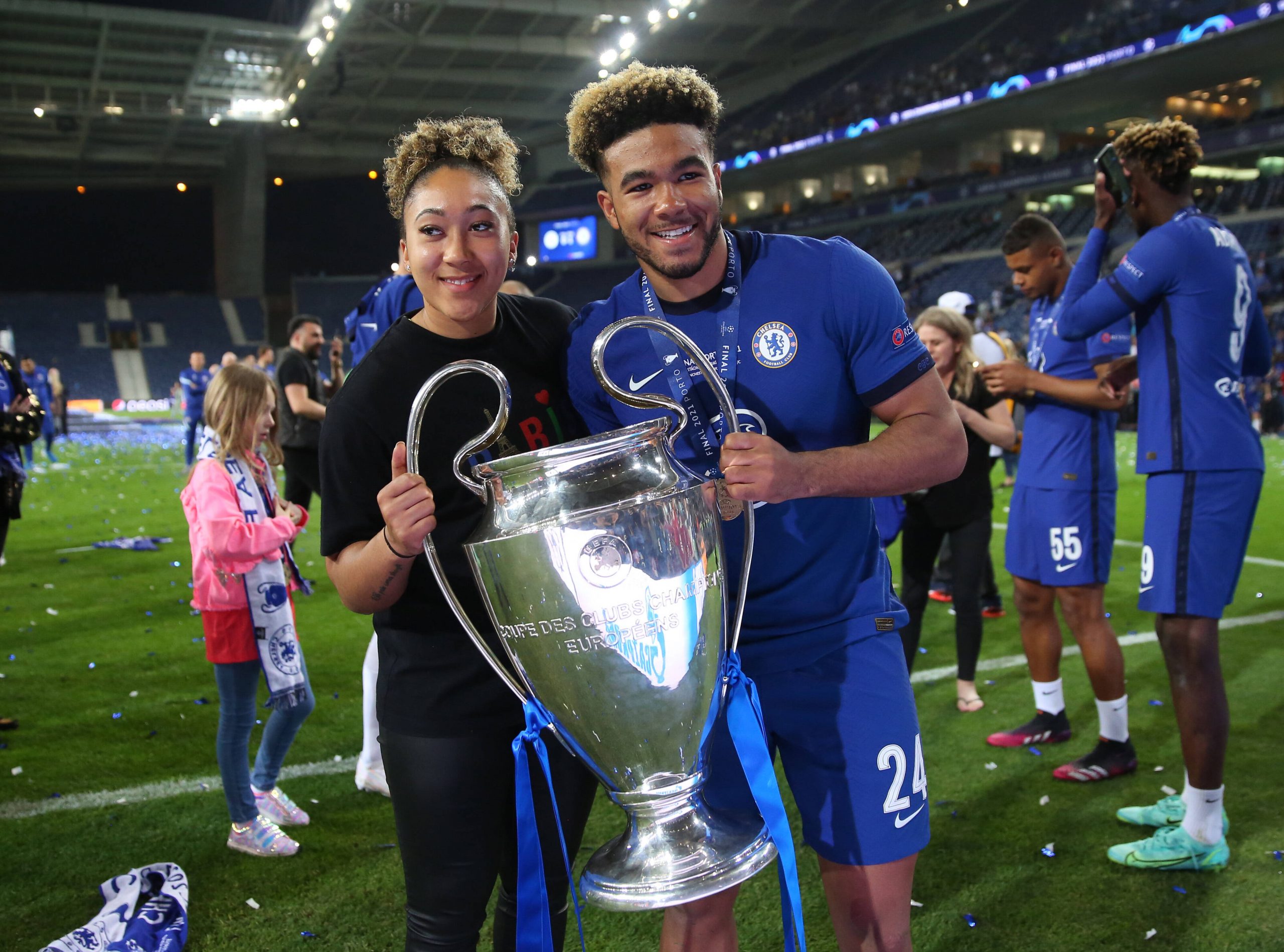 Porto, Portugal, 29th May 2021. Reece James of Chelsea poses with his sister Lauren James and the trophy during the UEFA